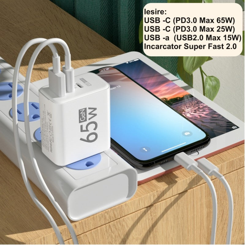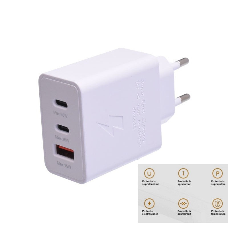 Забележителна мощност: С впечатляващия капацитет от 65 W, това зарядно устройство предлага достатъчно мощност за бързо и ефективно захранване на широка гама от устройства, от смартфони и таблети до лаптопи и други джаджи. Можете дори да зареждате устройства с по-високи енергийни изисквания.