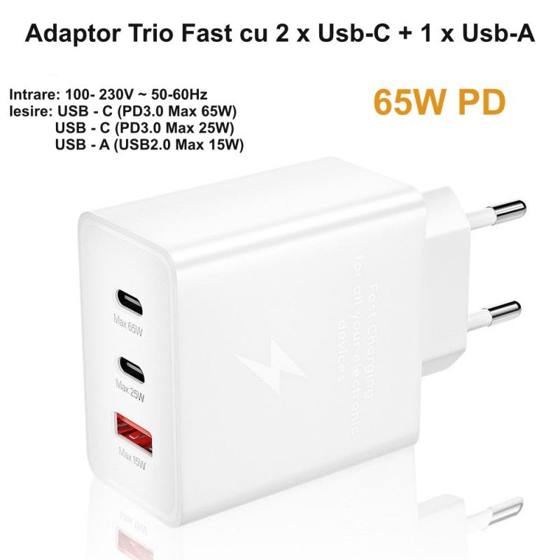 Зарядното устройство Rapid 65W PD Trio с 2 порта Type C и USB 2.0 порт е мощно и универсално решение за зареждане на вашите електронни устройства. Ето подробно описание: