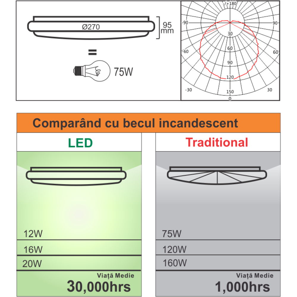 - Консумация: Енергийно ефективна, с ниска консумация от 12 W, еквивалентна на традиционна крушка от 75 W.