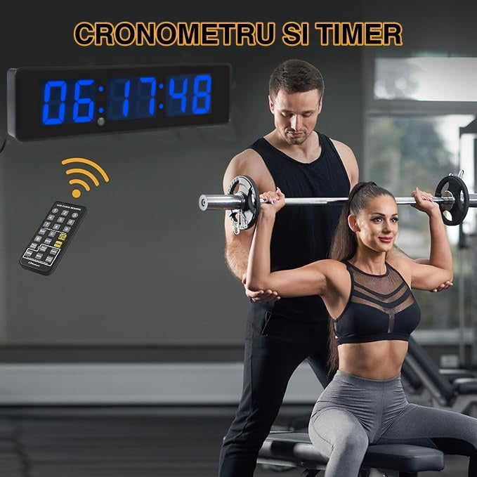 Ceas Digital de Masă și Perete 34x9cm cu LED Albastru – Cronometru, Timer și Alarmă cu Luminozitate Ajustabilă pentru Birou sau Spații Comerciale