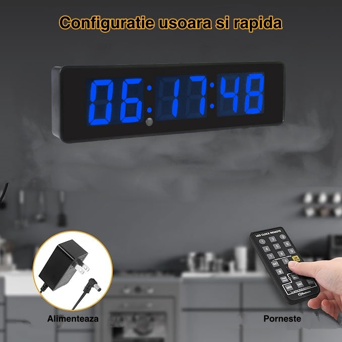 Ceas Digital de Masă și Perete 34x9cm cu LED Albastru – Cronometru, Timer și Alarmă cu Luminozitate Ajustabilă