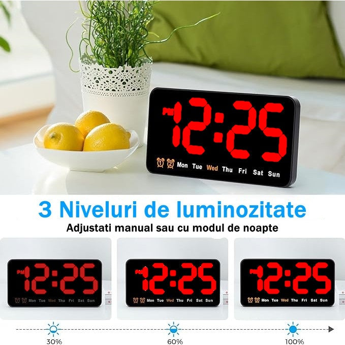 Ceas Digital de Masă și Perete 11x21cm cu Afișaj LED Roșu – Alarmă, Calendar, Temperatură și Funcție Snooze