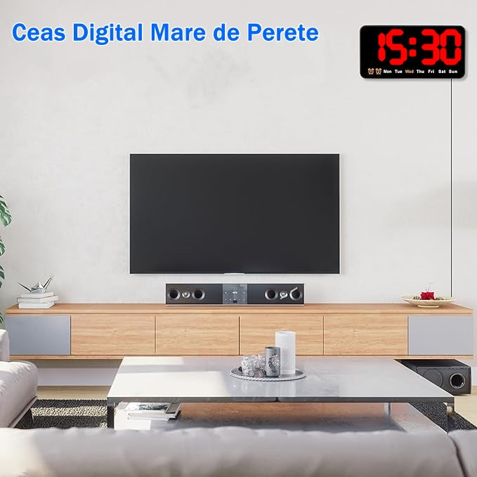 Ceas Digital de Masă și Perete 11x21cm cu Afișaj LED Roșu, Alarmă, Calendar, Temperatură și Funcție Snooze – Mod de Noapte pentru Birou sau Dormitor