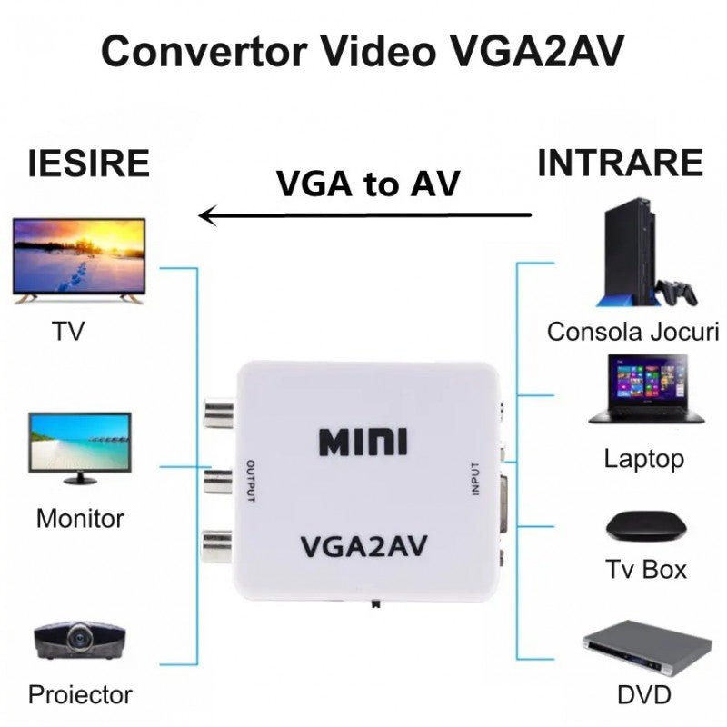 - Compatibilitate extinsă – Conectează o varietate de dispozitive cu ieșire VGA la televizoare și proiectoare cu intrare AV.