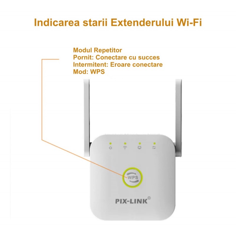 Extender Wireless N Pix-Link cu 2 Antene – Viteză de 300Mbps și Configurare Ușoară prin WPS