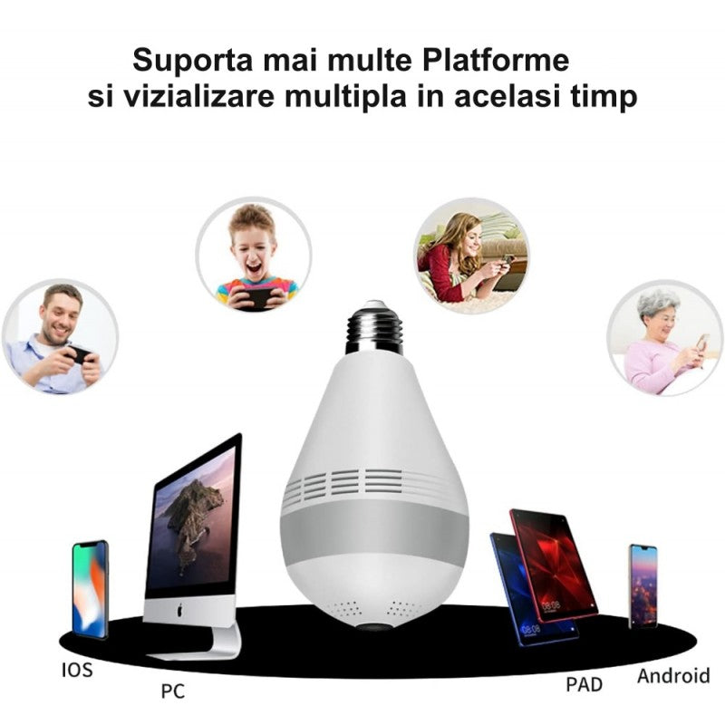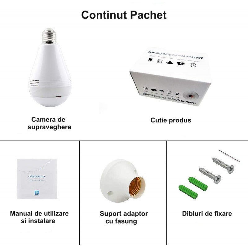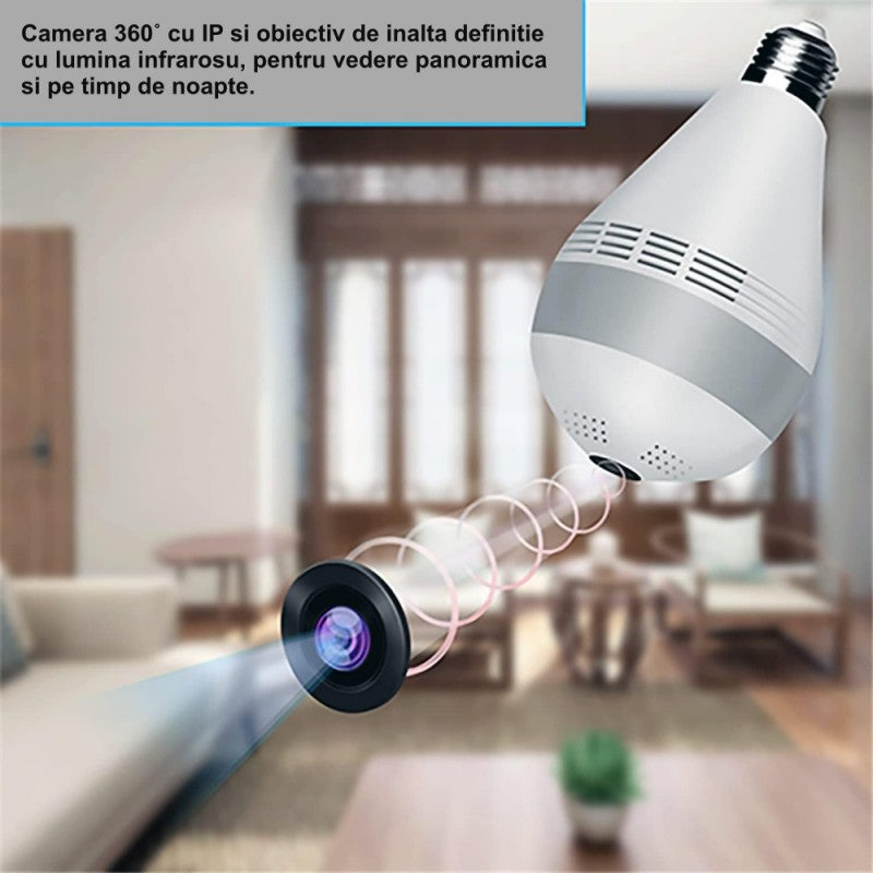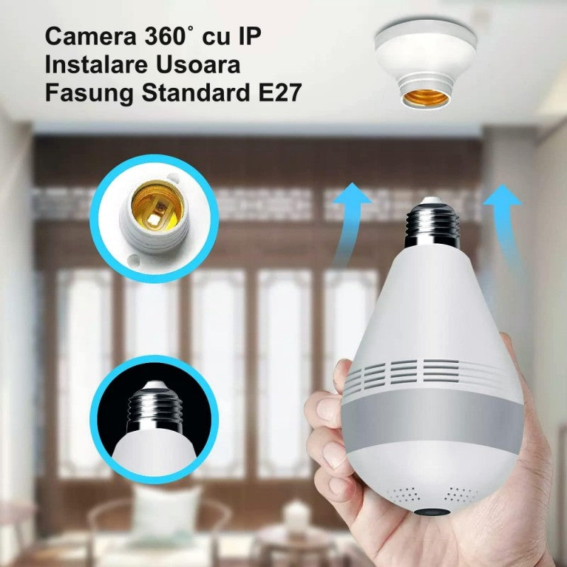 - 1 x Cameră de Supraveghere 360˚ Tip Bec cu IP Wireless, Full HD / V380