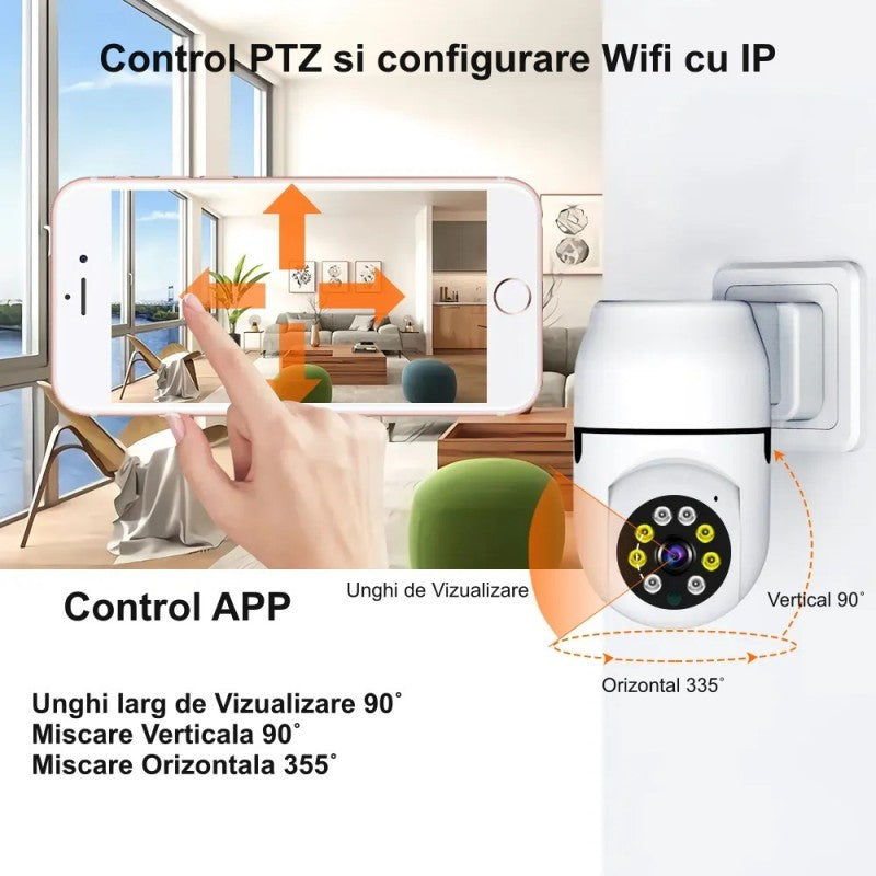 Camera de Supraveghere PTZ 360˚ la Priză cu WiFi și Control APP V380 – Monitorizare Securitate pentru Casă și Birou