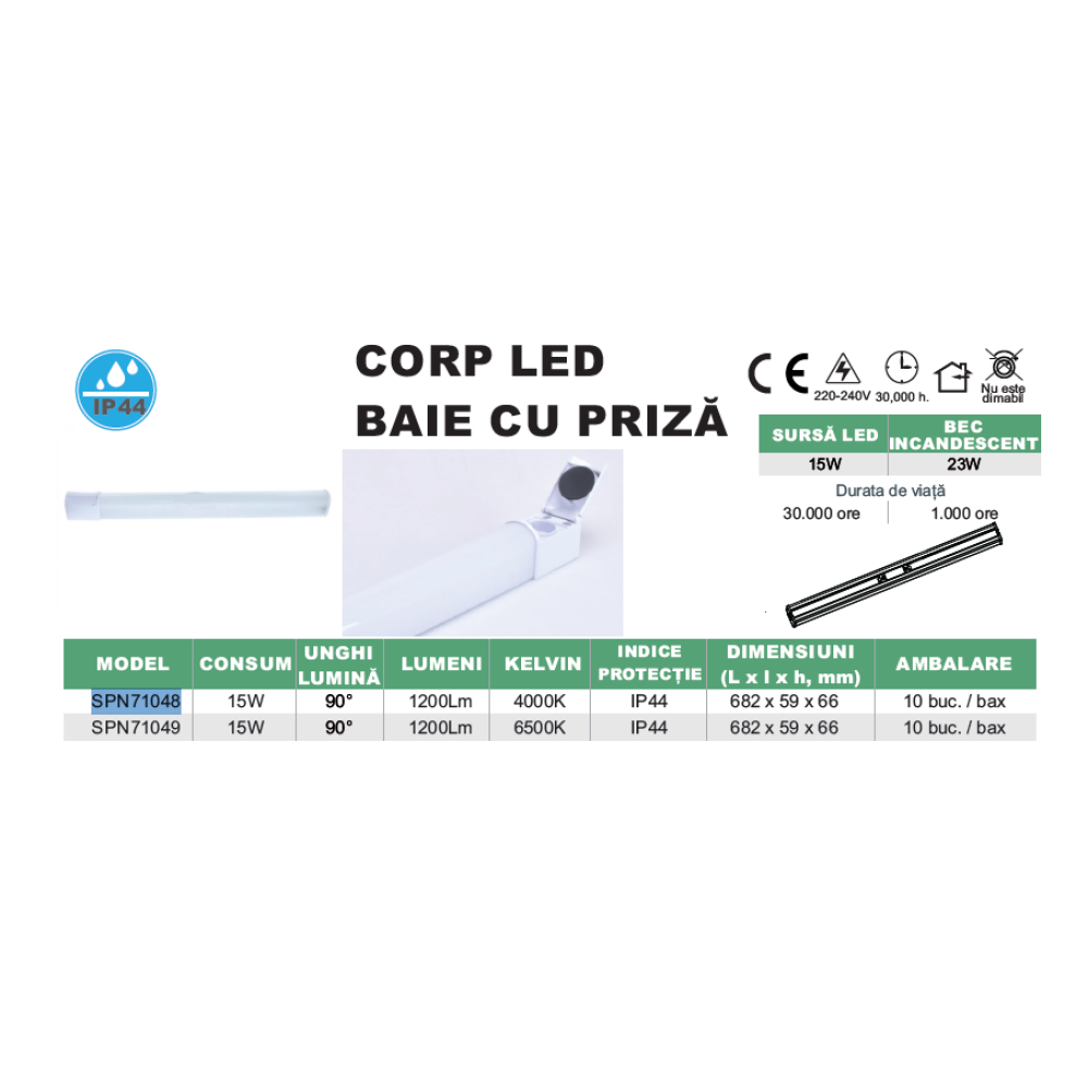 Corp LED pentru Baie Alb 15W, 6500K – Lumină Rece cu Protecție IP44 și Priză Integrată