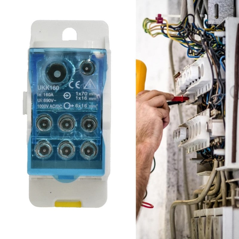 A 160A - UKK160 elosztó sorkapocs, más néven megszakító, hatékony megoldás az elektromos utak összekapcsolására és sokszorosítására különféle alkalmazásokban. Ez a 160 A-ig terjedő terhelés kezelésére tervezett megszakító ideális fő tápvezetékek leágazásához.