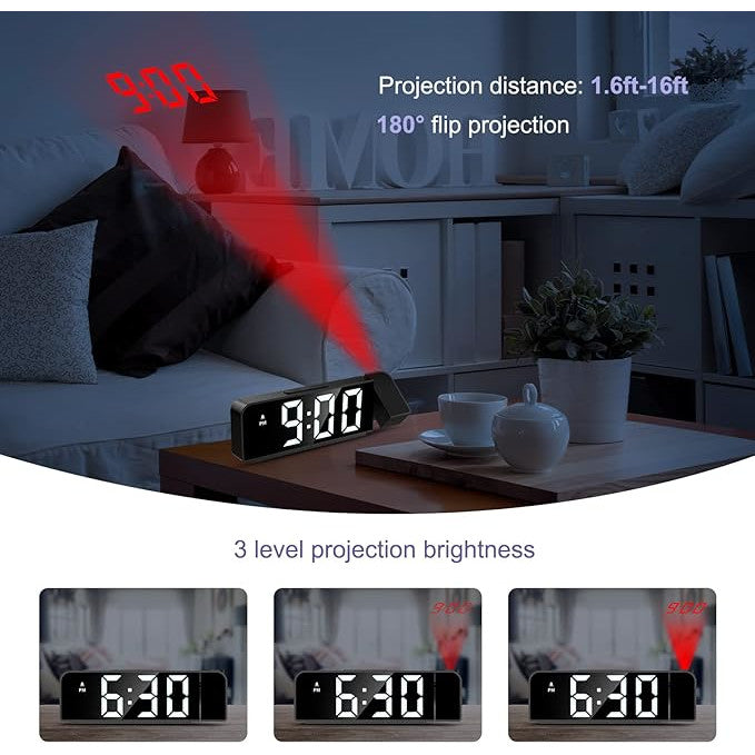 Digitális asztali óra fehér LED fénnyel, 5M-ig vetítés, hőmérséklet, riasztó, hőmérő, szundi funkció, állítható fényerő, 20x8 cm