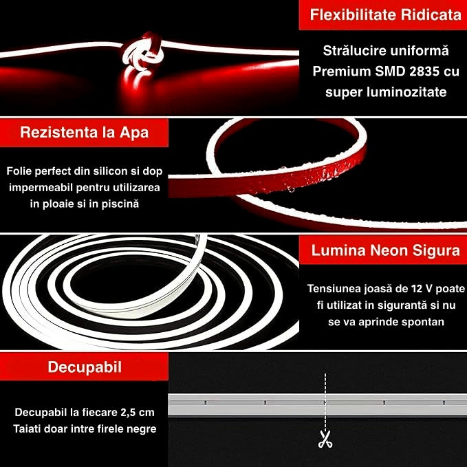 Banda Neon LED Roșu Închis de 5M – Iluminat Rezistent la Apă pentru Interior și Exterior, cu Adaptor Inclus
