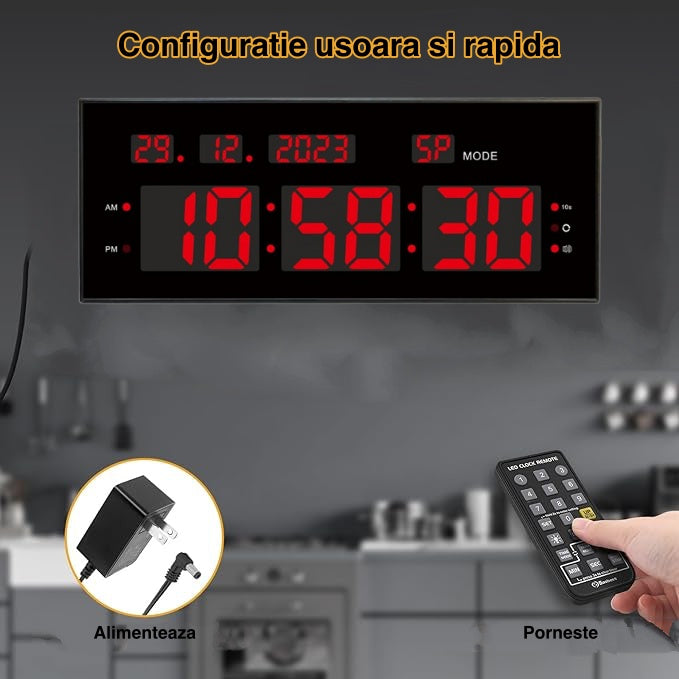 Ceas Digital de Masă și Perete 32x12cm cu Cronometru, Alarmă, Calendar și Afișaj LED Roșu – Ideal pentru Birou sau Spații Comerciale