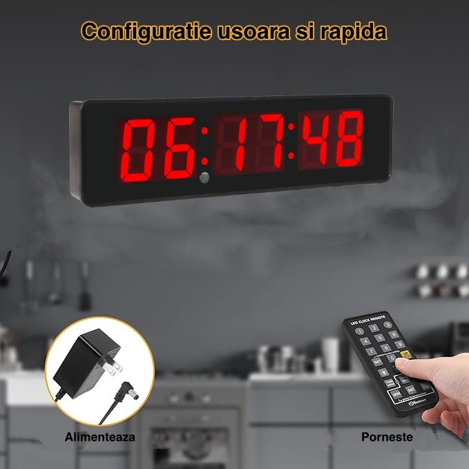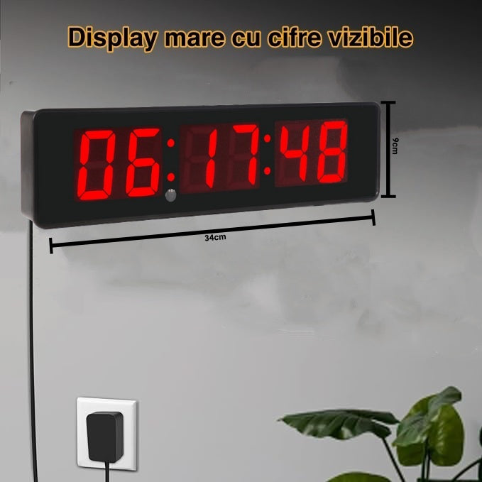 Ceas Digital de Masă și Perete 34x9cm cu LED Roșu – Cronometru, Timer, Alarmă și Luminozitate Ajustabilă