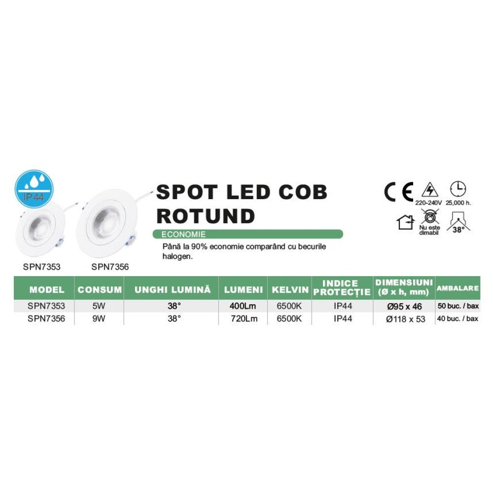 Spotul LED Rotund COB de 9W oferă o lumină rece de 6500K, ideală pentru birouri, spații comerciale și locuințe. Cu un echivalent de 160W în iluminatul tradițional, acest spot asigură o iluminare eficientă și economisire de energie, fiind soluția perfectă pentru un ambient energizant.