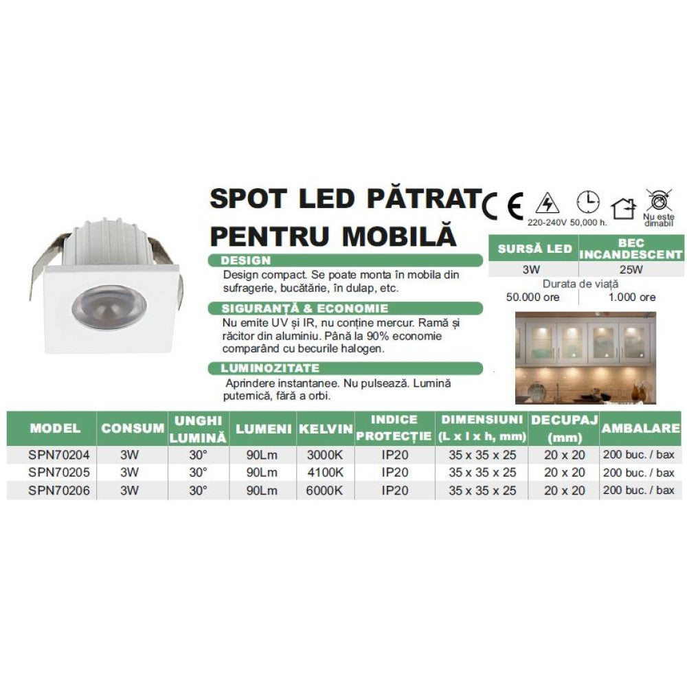 Spot LED Pătrat 35x35mm, 3W, Lumină Neutră 4100K – Ideal pentru Mobilă și Iluminat Interior