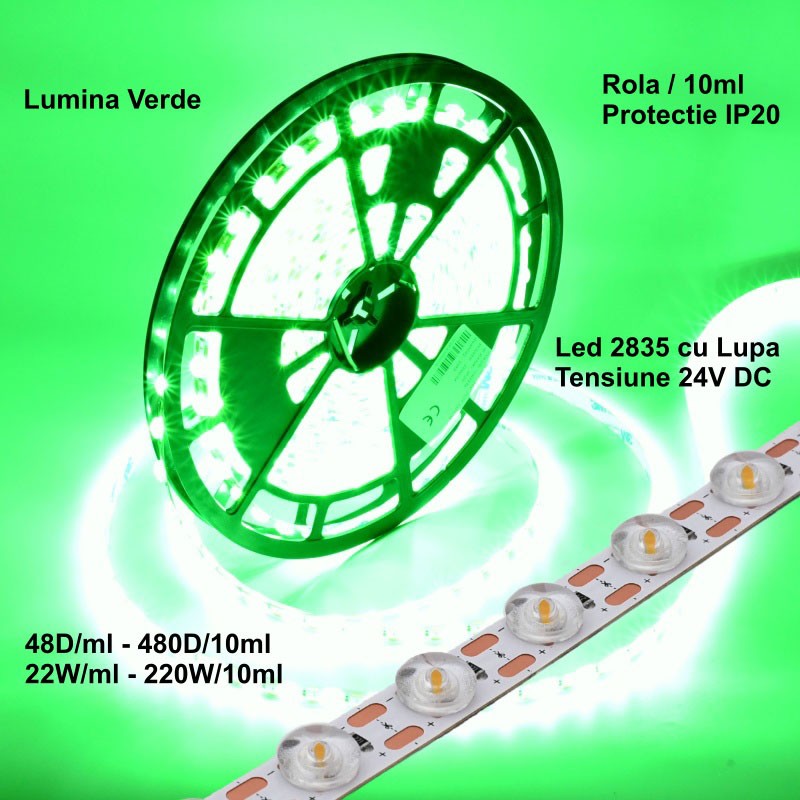 - 1 x Bandă LED 2835 cu Lupă - 24V - 480 LED-uri - 220W, IP20 - Lumină Verde, Rolă 10m