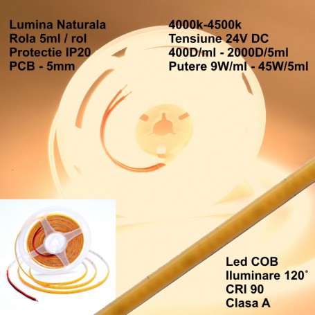Banda LED COB 5mm - 400 LED/m, DC 24V, 9W/m, IP20, Alb-Natural 4500K - Rola de 5m pentru Iluminat Interior