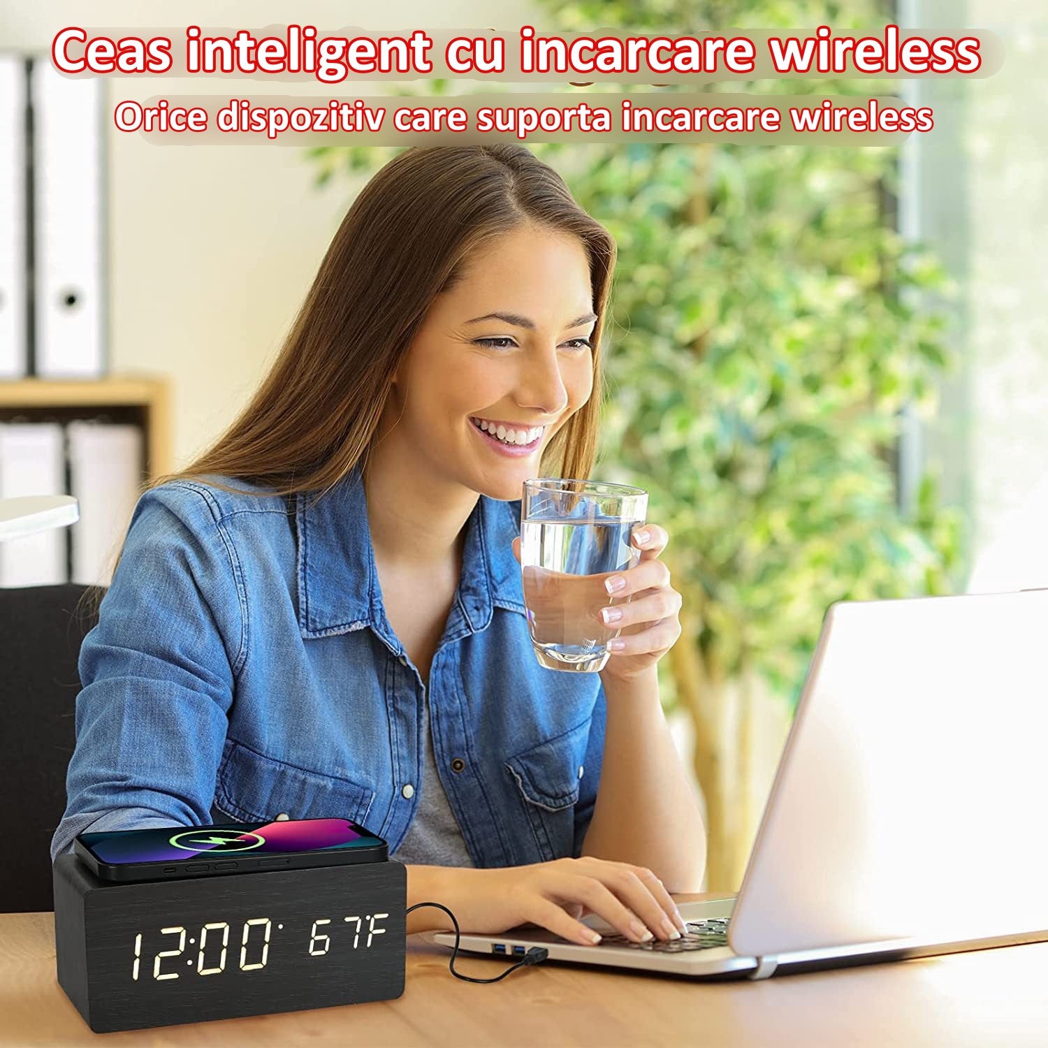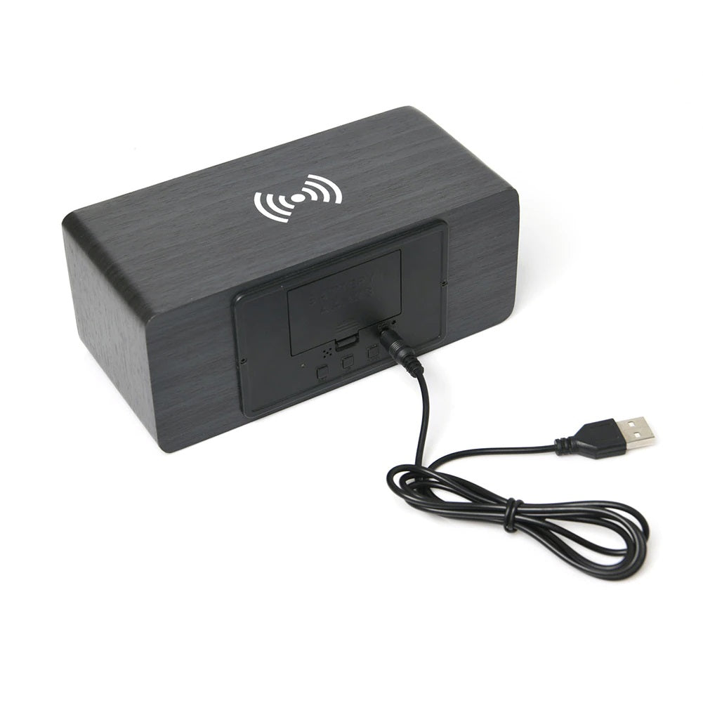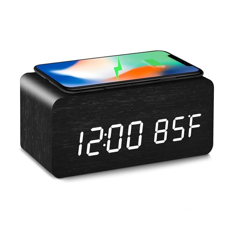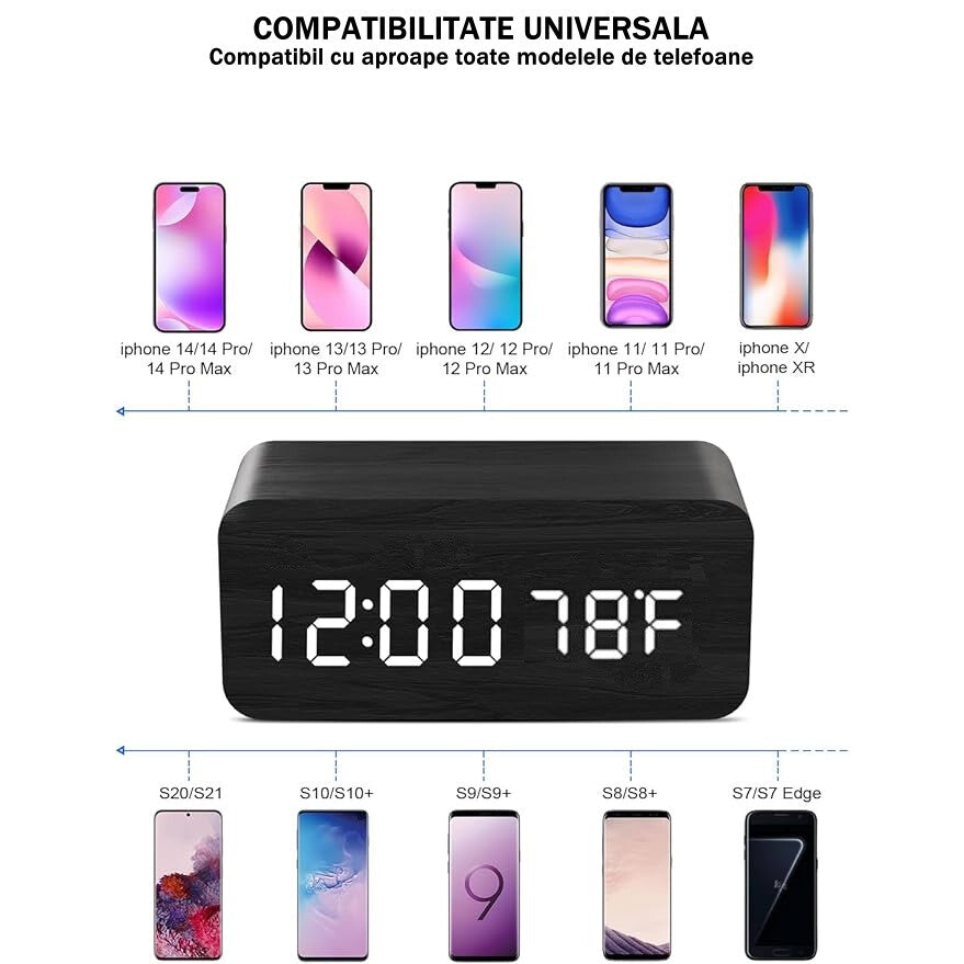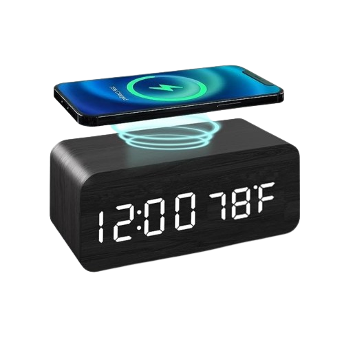 Ceas Digital de Masă cu Încărcare Wireless – LED Alb, Termometru, Alarmă și Comandă Vocală