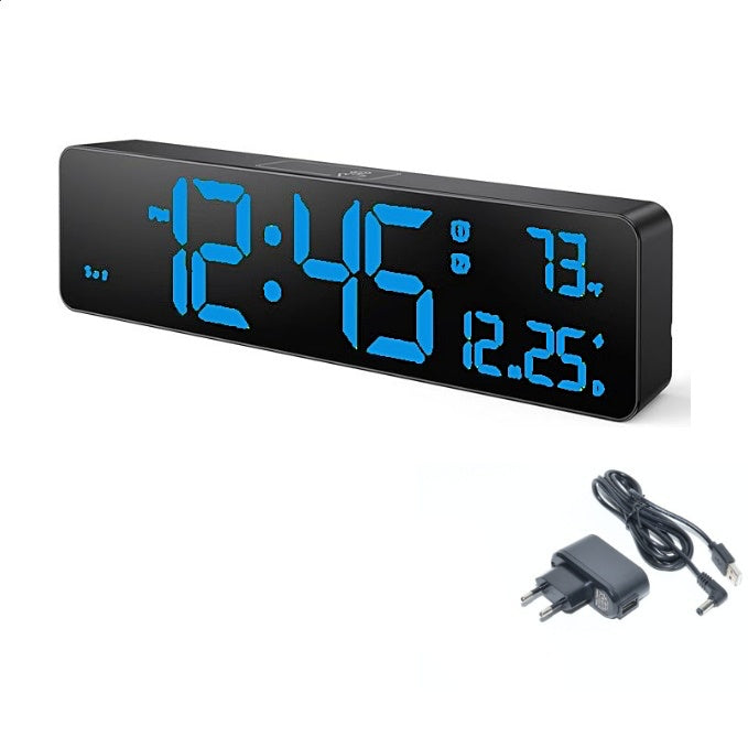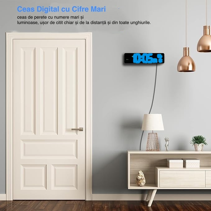 Ceas Digital de Masă și Perete 26x6cm – LED Albastru, Cronometru, Timer, Alarmă, Funcție Snooze, Temperatură, Luminozitate Ajustabilă