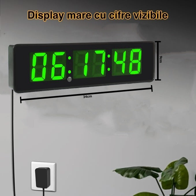 Descoperiți Ceasul Digital de Masă și Perete cu LED Verde, un dispozitiv versatil ce combină eleganța cu utilitatea. Cu un ecran LED clar și funcții precum cronometru, timer și alarmă cu snooze, acest ceas este perfect pentru birouri sau spații comerciale. Dimensiunile sale de 34x9cm îl fac ușor de observat, iar luminozitatea ajustabilă permite o utilizare confortabilă în orice mediu. Ideal pentru a vă ajuta să rămâneți organizat și punctual.