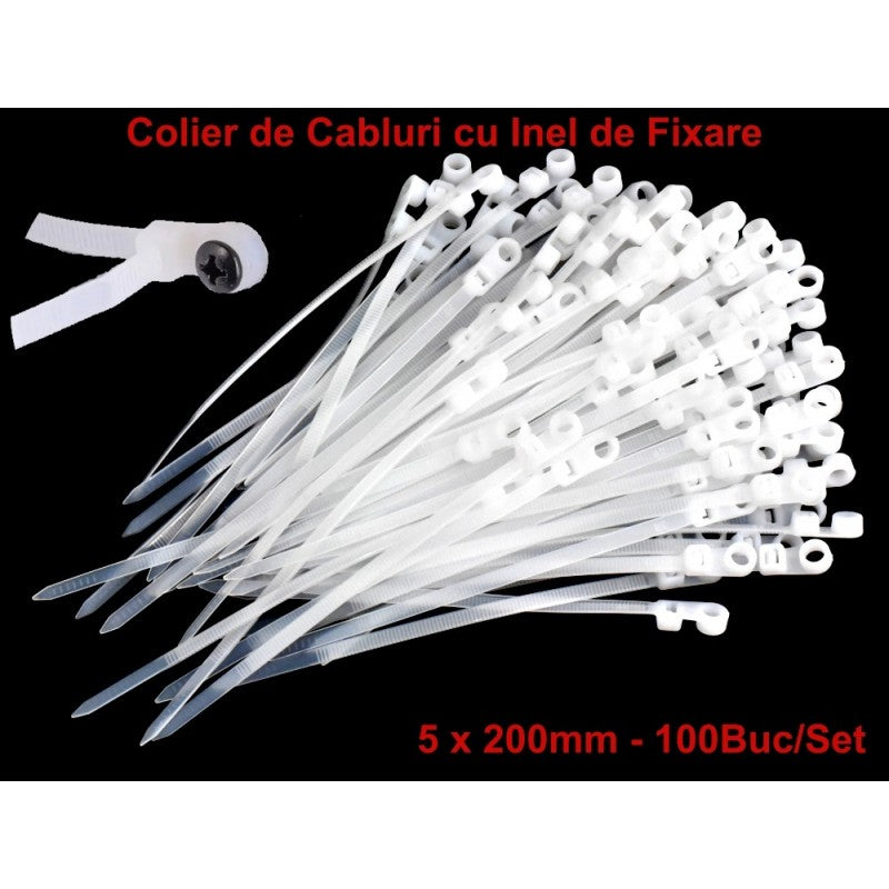 • 1 x Set de Coliere de Plastic Alb 5 x 200mm, cu Cap Montabil - 100b/Set
