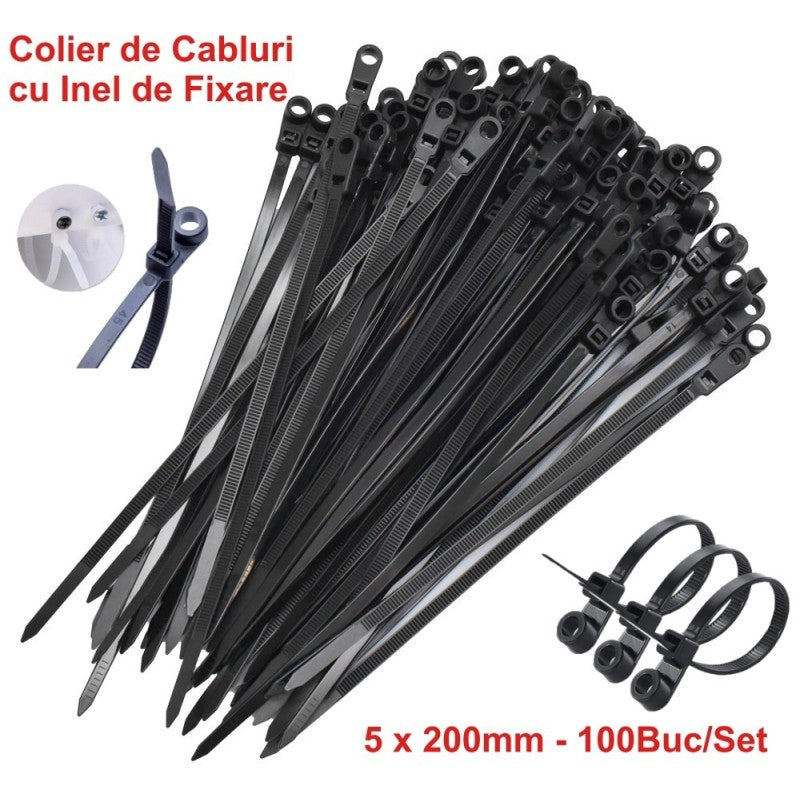 Colier de Plastic Negru 5 x 200mm cu Cap Montabil – Set de 100b pentru Organizarea Cablurilor și Ușurința Instalării