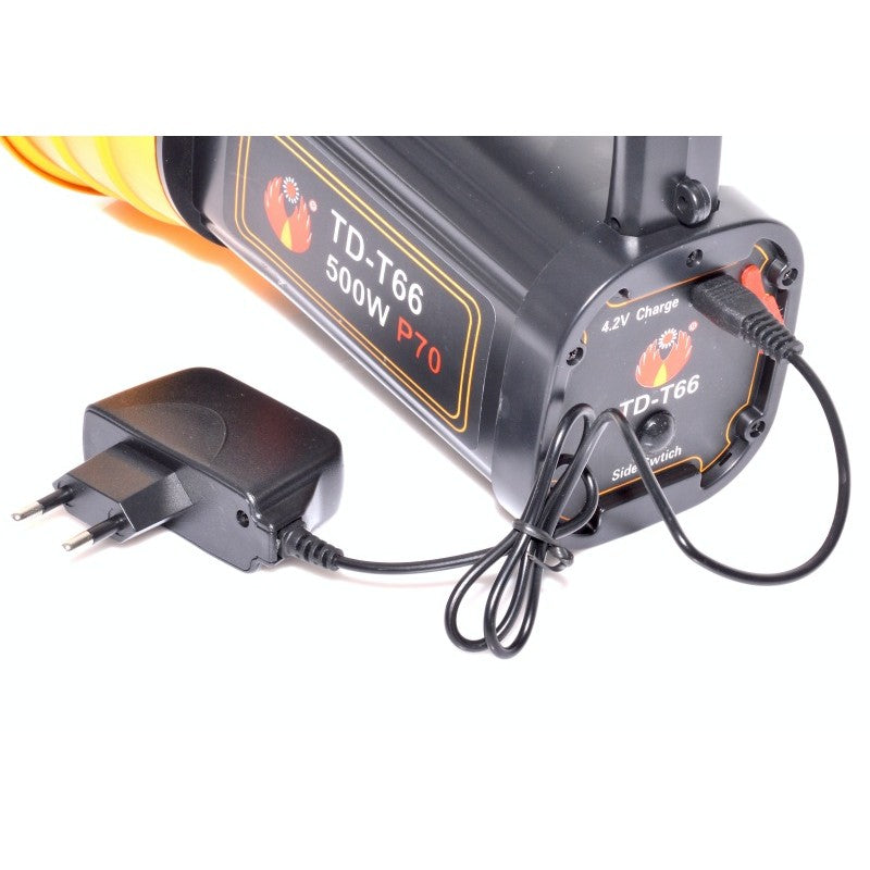 On the handle it has two push buttons to control the power light and the charging socket for the built-in Li-Ion batteries, which have a capacity of 12000mAh. Thanks to the power of the batteries, it can be used up to 18 hours in low light. The flashlight is very easy to use and thanks to the light weight of the Li-Ion batteries.