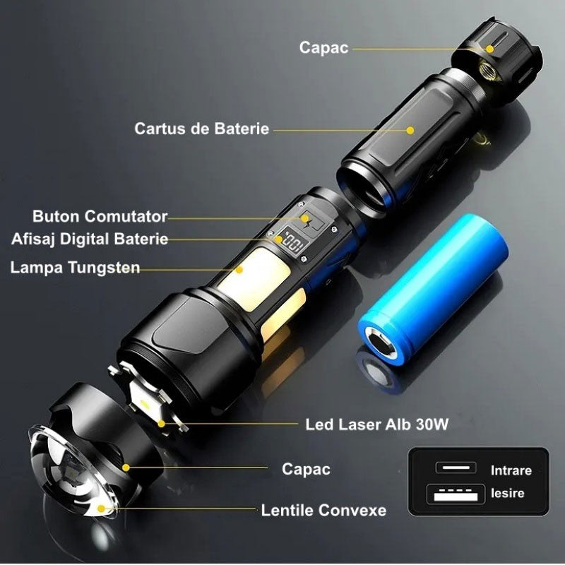 - Funcție de zoom ajustabilă – Reglabilă pentru a controla fasciculul de lumină.