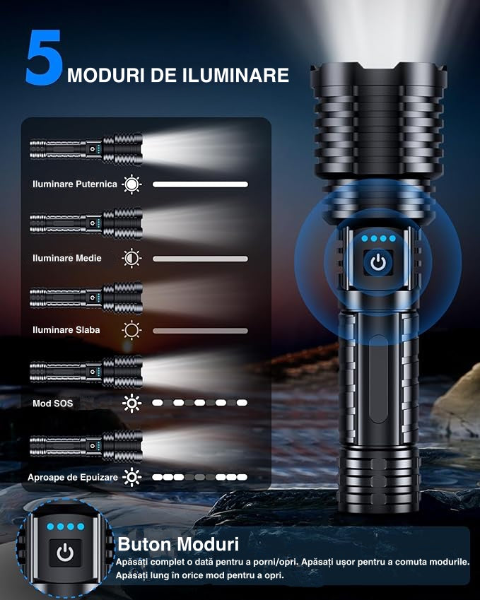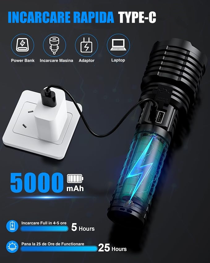 Lanterna Profesională VTM® cu LED - Încărcare Type-C, 4 Acumulatori Inclusi, Iluminare până la 1500m, Ideală pentru Pescuit, Camping și Vânătoare