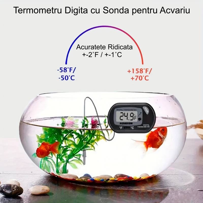 Termometrul Digital pentru Acvariu este esențial pentru a menține un mediu sănătos pentru pești și plante acvatice. Cu un interval de măsurare de la -50˚C la 70˚C, acest termometru oferă o monitorizare precisă a temperaturii apei, asigurând condiții optime pentru viețuitoarele acvatice. Ecranul LCD clar permite verificarea ușoară a temperaturii în timp real, fiind ideal atât pentru începători, cât și pentru acvariști experimentați.