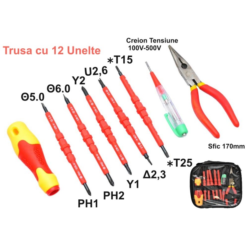 Trusă de Unelte Electrician 12 Piese – Set Complet pentru Lucrări Electrice și Reparații