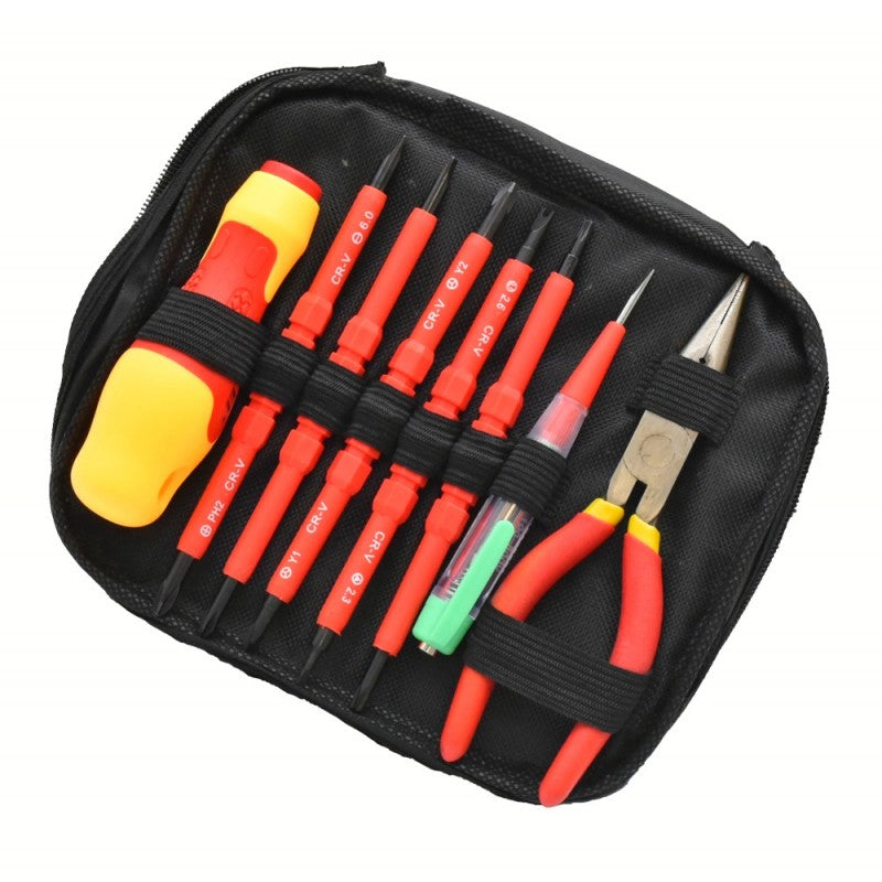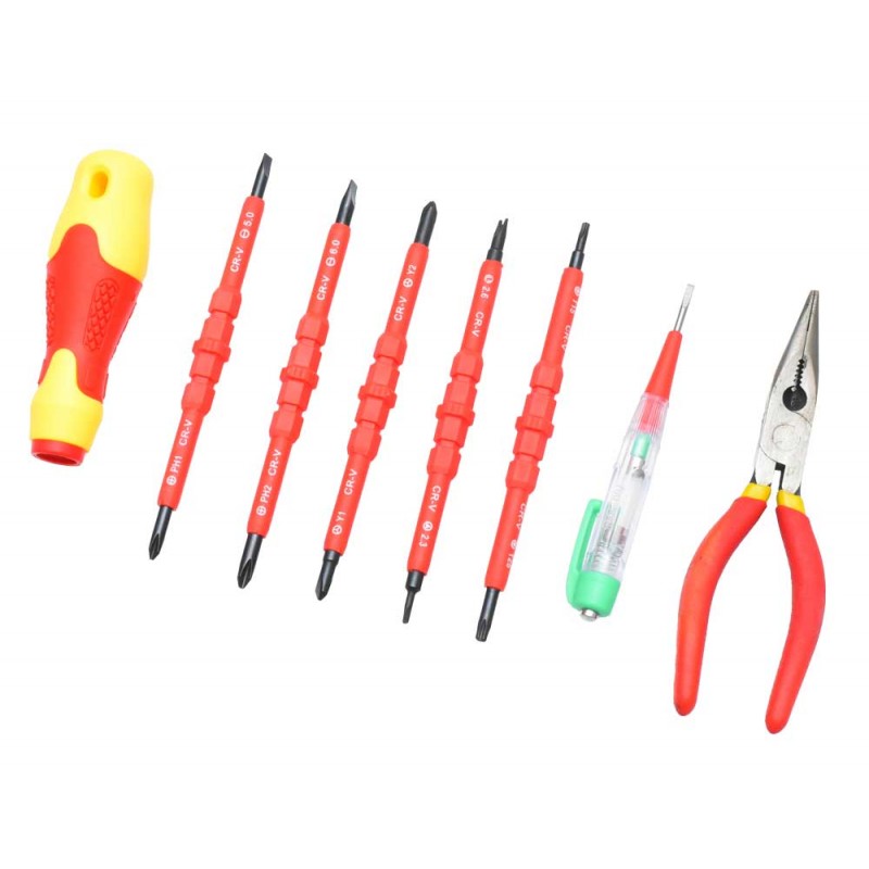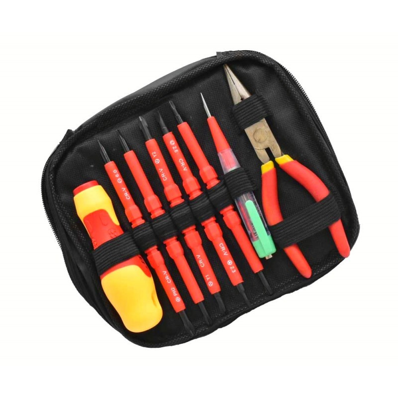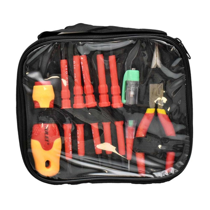 Pachetul include șurubelnițe, un sfic și un creion de tensiune, toate esențiale pentru electricieni.