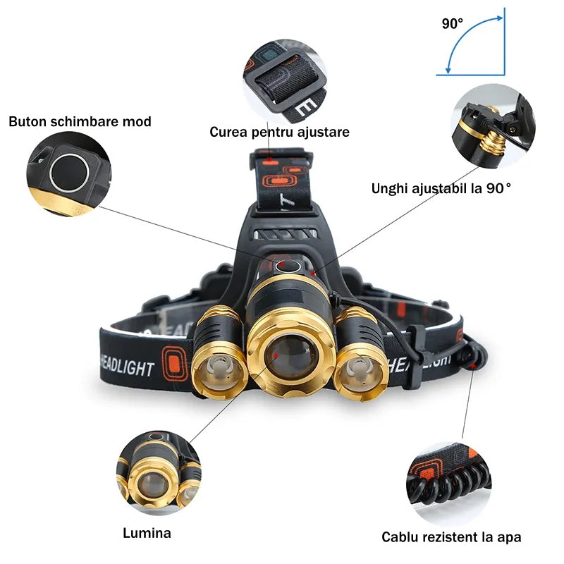 Lanterna Frontala cu Zoom și Acumulatori Inclusi - Rezistentă la Apă, Rotire 90° și 4 Moduri de Lumina pentru Pescuit, Camping, Vânătoare
