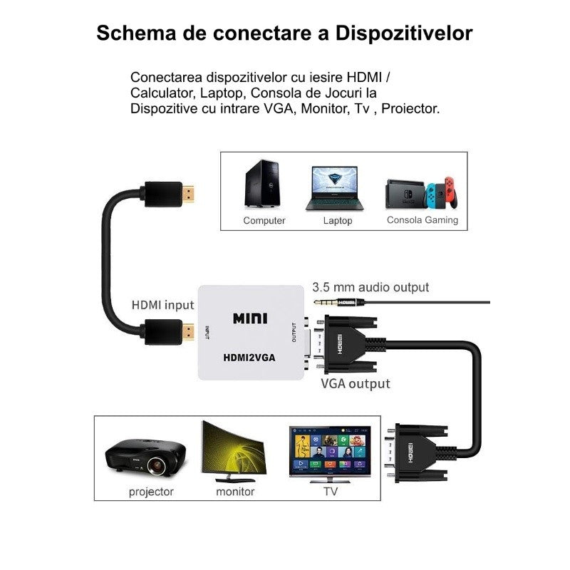 Convertor Video Mini HDMI la VGA 1080P cu Audio – Adaptator HDMI-VGA HDV-630 pentru Proiectoare, Monitoare și Telefoane