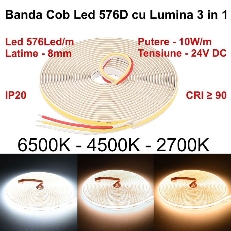 Banda LED Digital COB 576D/m, Lumina 3 în 1 Alb 2700K-4500K-6500K, 24V, 10W/m, RA 90, Protecție IP20, Rola/5m
