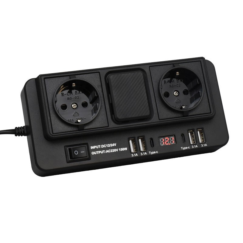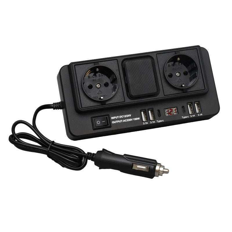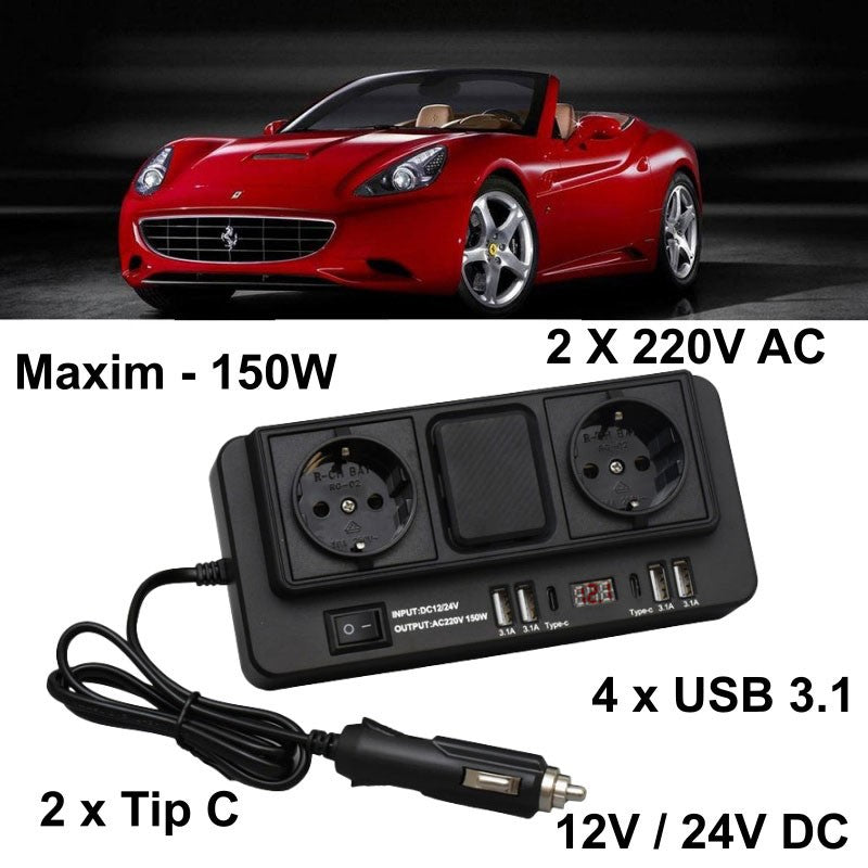 Invertor Auto de Tensiune 150W, 12/24V DC la 2 x 220V AC, 4 x USB 3.1, 2 x Tip C