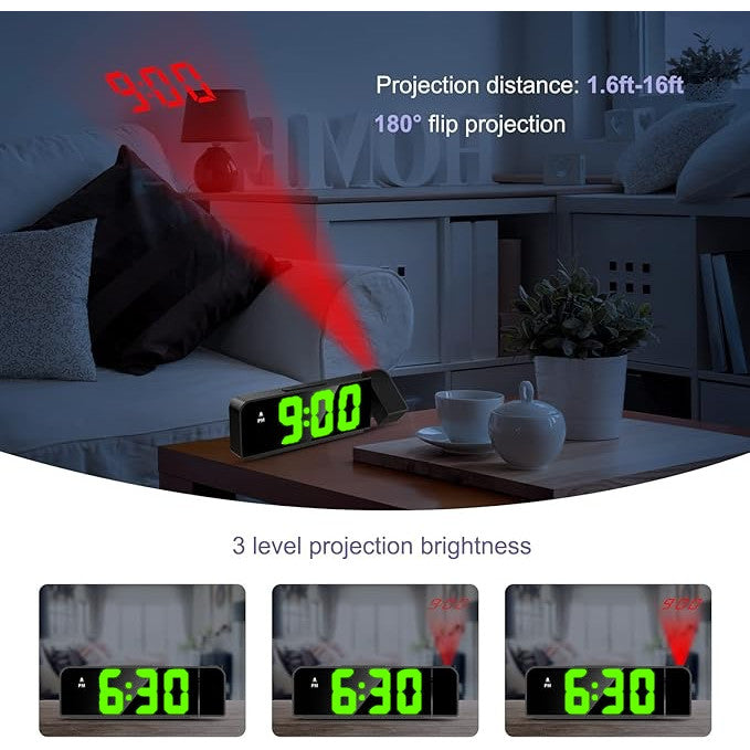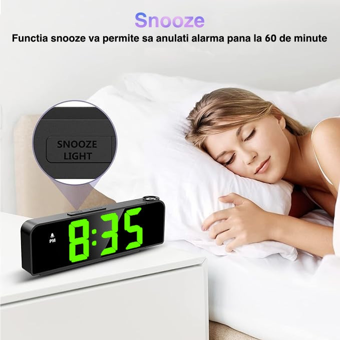 Ceas Digital de Masă cu Proiecție Verde până la 5m – Afișaj cu Temperatură, Alarmă, Termometru și Funcție Snooze, Dimensiuni 20x8cm, Luminozitate Ajustabilă