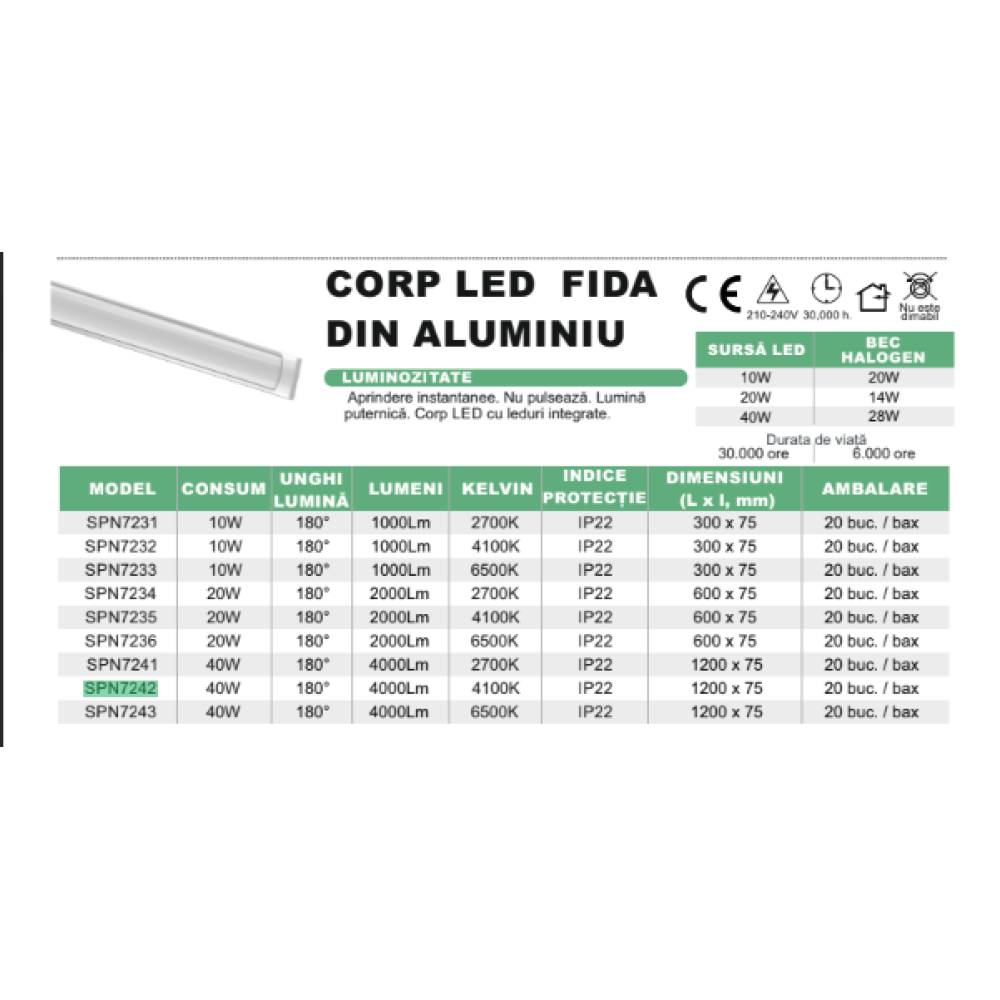 Corp LED Fida 40W oferă o iluminare neutră ideală pentru birouri și spații interioare, asigurând un mediu de lucru eficient și confortabil. Cu un design modern din aluminiu, acest corp de iluminat este durabil și ușor de instalat, având o durată de viață medie de 30.000 de ore.